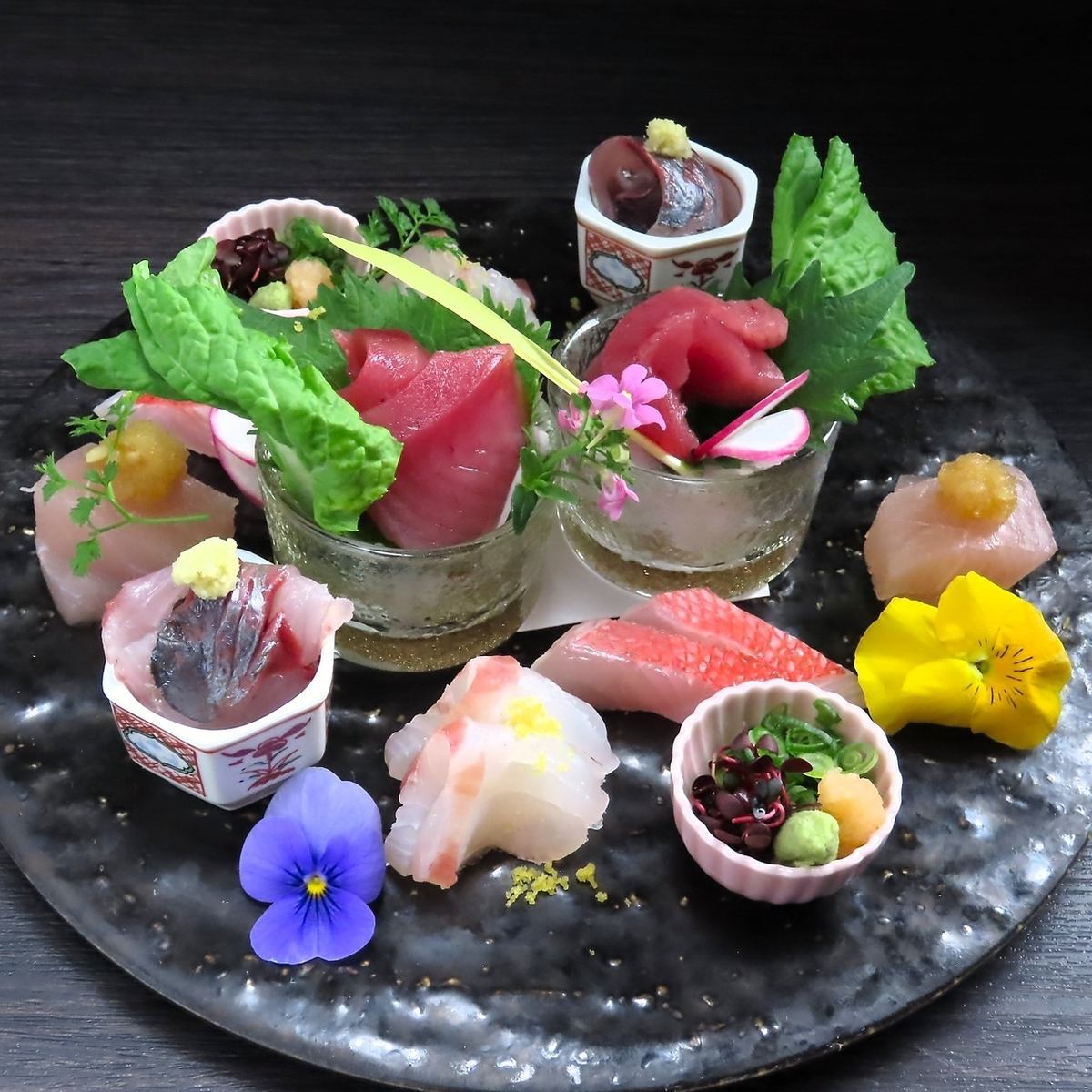 夫婦で板前をつとめる店主と女将が、市場で「これだ!」と思った新鮮な魚を選び抜いた刺身盛り合わせ!4、5種類をバランスよく盛りつけ、気軽に楽しめるのに本格的な味わいが魅力です。食べることが大好きでこの世界に飛び込んだ二人ならではの丁寧な仕事が光り、初めての方にも人気の一皿です◎
